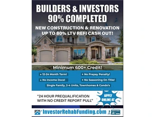 BUILDERS and FIX & FLIP INVESTORS–CASHOUT REFI ON 90% COMPLETED HOMES!