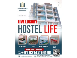 Sushila Tower Hostel is one of the best luxury AC Hostel near Manipal University in Jaipur, offering all modern amenities such as AC Rooms, Gym, Rooftop Swimming Pool, Library, Coffee Cafe, Canteen and much more.
