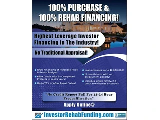 Fix & Flip Funding. 100% Of Purchase & 100% Of Rehab Up to 70% Of ARV. Requires 680+ credit and 5+ completed rehab projects in the last five (5) years. No traditional property appraisal. Rehab budget cannot exceed 50% of the purchase price. Investor Loans from $150,000.00 to $2,000,000.00. Single-family and 2-4 units. Fast Closings. 12-month term with no prepayment penalty. 24-hour prequalification WITH NO CREDIT PULL.